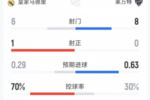 双方仅1次射正,皇马0-0莱万特半场数据:射门6-8,射正1-0