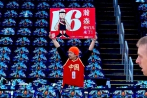 某球迷穿着中国男篮的球衣并高举牌子,上面写着:“瀚森,哥们来了!”