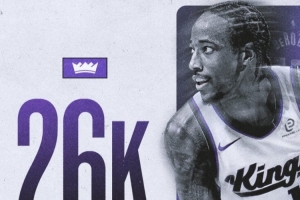 德罗赞常规赛生涯总得分突破26000大关,NBA历史第23人,现役第六人,仅次于詹姆斯、杜兰特、哈登、威少、库里。